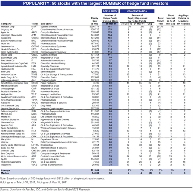 Jak jste si určitě všimli, na prvních deseti pozicích (za Q1 2011) jsou hodně zastoupeny finanční instituce (C, JPM, BAC), technologické (MSFT, AAPL, GOOG, QCOM, HPQ, CSCO) a farmaceutické firmy (PFE) s velkou tržní kapitalizací (nad 79 mld. USD). Oproti předcházejícímu čtvrtletí je v první desítce místo General Motors (GM) společnost Qualcomm (QCOM).