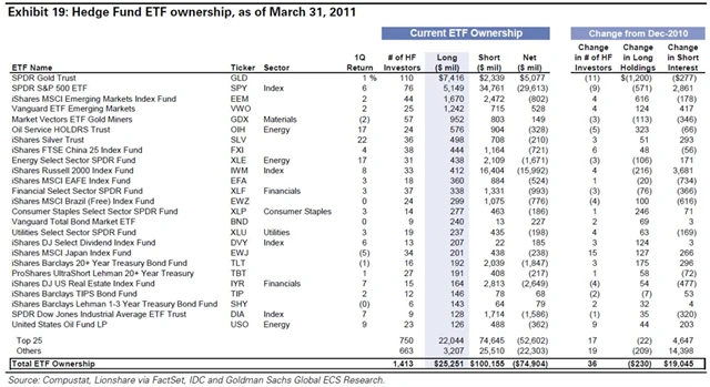 Není pravda, že hedgeové fondy investují do zlata hlavně skze ETF. Obecně tito investoři investují přímo do fyzického zlata a vyhýbají se „papírové“ investici do ETF. Goldman Sachs naznačuje, že 11 fondů uzavřelo pozice v SPDR Gold Trust (GLD je stále nejvíce držený ETF investující do zlata), s 20% poklesem v expozici ze 6 miliard USD na 5 miliard USD.