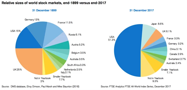 Ben Carlson ze společnosti Ritholtz Wealth Management totéž uvádí také v souvislosti s grafem, který se objevil v publikaci Credit Suisse nazvané Global Investment Returns Yearbook 2018. Na něm je zobrazena relativní velikost jednotlivých akciových trhů na konci 19. století a na konci roku 2017.