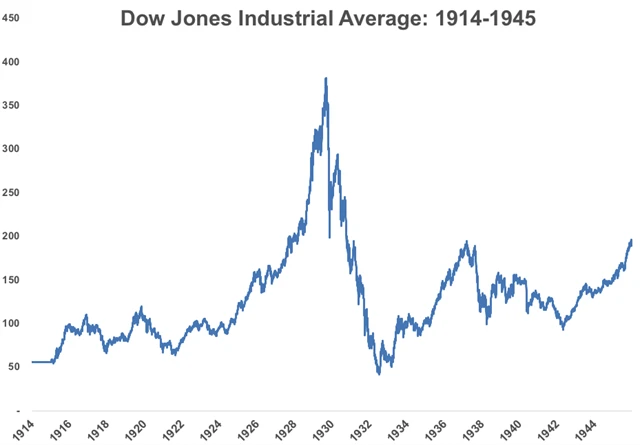 V současnosti se považuje téměř za samozřejmost, že USA jsou největším trhem, ale vždy tomu tak nebylo. Podobné zkreslení lze nyní vidět na většině grafů, které mají prokázat, že je strategie "kup a drž" dlouhodobě výdělečná. Když se ale podíváme na graf vývoje indexu Dow v letech 1914-1945, investoři v té době by nejspíše nesouhlasili.