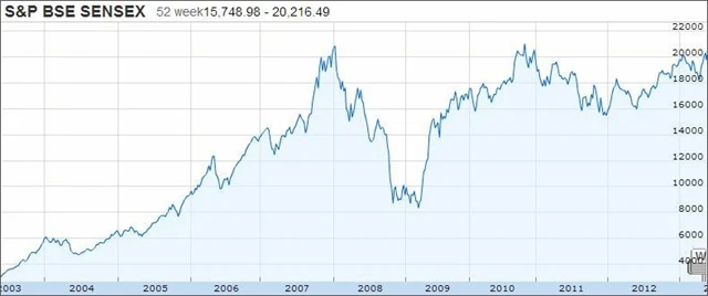Indický akciový index Sensex v posledních dvou letech nijak významně neperformoval. Růst zisků byl doprovázen strukturálním poklesem v ocenění podle P/E, což je v souladu s nižším strukturálním tempem růstu HDP. Investoři nyní platí za indický akciový trh zhruba 11násobek zisku, což by implikovalo, že věří v setrvání 6% růstu.