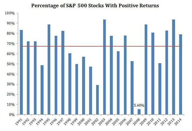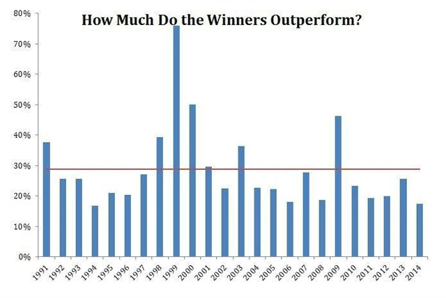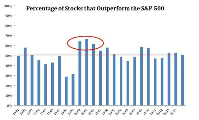 Pokud se podíváme na průměr, asi polovina akcií je na tom v kterémkoli roce lépe než index (50,6 %) a polovina za indexem zaostává. V období posledních 24 let porazilo nejvíce titulů index v roce 2001 (66,5 %), nejméně to bylo v roce 1998 (29 %).