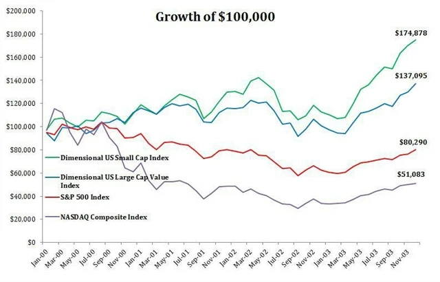 Z grafu níže je patrné, že ti, kteří se po roce 1999 odvrátili od technologických akcií, udělali dobře. A je jedno, zda investovali do velkých, nebo malých společností.