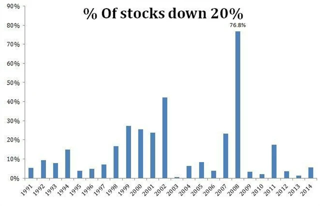 Rok 2008 pak byl špatný nejen pro index, ale také pro jednotlivé akcie, když pouze 5 % z nich skončilo v plusu.