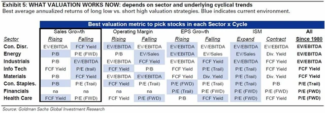 "Použití valuací k výběru akcií je efektivní, ať už sledujete indexy, nebo sektory, ale v případě výběru akcií v různých sektorech je dobré použít rozdílné oceňovací strategie. Správná strategie se také liší podle cyklů tržeb, zisků na akcii a marží v sektoru a podle fáze hospodářského cyklu (americké) ekonomiky," píší experti z Goldman Sachs Stuart Kaiser, David Kostin, Amanda Sneider a Ben Snider.