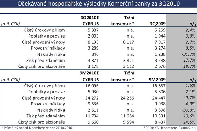 Komerční banka zveřejní své konsolidované výsledky hospodaření dle IFRS za třetí čtvrtletí 2010 ve středu 3. listopadu 2010 před otevřením trhu. Jaké výsledky mohou investoři očekávat a jak na ně bude s velkou pravděpodobností reagovat kurz akcií Komerční banky?