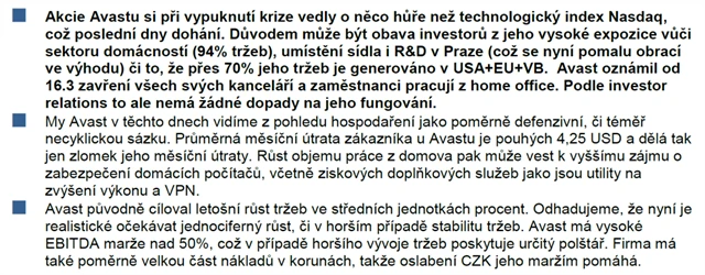 Celkově by výsledky Avastu neměly být vývojem kolem koronaviru výrazněji zasaženy. Dlouhodobě lze sice očekávat pomalejší růst tržeb z důvodu horší situace spotřebitelů, i tak ale nedávný výrazný propad ceny akcií nereflektuje potenciální změnu fundamentu firmy. Avast se obchoduje na 7-8% výnosu z volného cash flow. Práce z domova je přitom trend, který může podporovat poptávku po produktech firmy. Titul by tak měl být jedním z vítězů současné situace.