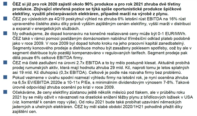 Celkově vnímáme ČEZ jako dobře zajištěnou a relativně levnou sázku na očekávaný dlouhodobý pozitivní vývoj cen elektřiny. Krátkodobě je cena akcií podpořena vysokým očekávaným dividendovým výnosem. Ceny elektřiny budou pravděpodobně kvůli válce na trhu s ropou ještě několik měsíců pod tlakem, ale nízké ocenění by mělo titul stabilizovat.