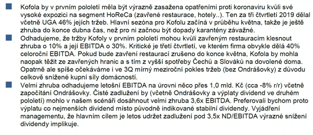 Ocenění Kofoly vnímáme jako velice konzervativní, výrazné snížení dividendy by v aktuální nejisté situaci bylo podle nás dobrou zprávou.