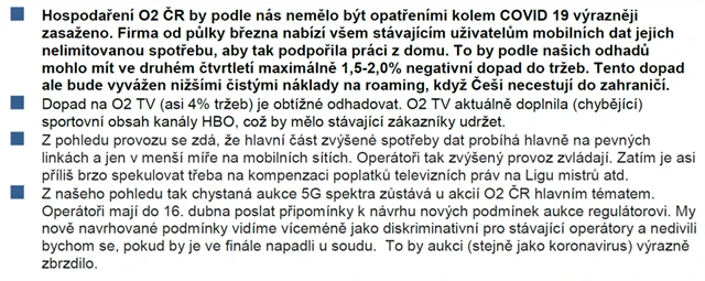 Celkově vidíme O2 Czech Republic jako velice odolný titul pro současné prostředí. Opatření proti koronaviru by měla mít krátkodobě dopad nanejvýše v nízkých jednotkách procent (ve 2Q2020 i v rámci celého roku). Nečekáme proto dopad na výši dividendy. Titul se obchoduje s očekávaným dividendovým (hrubým) výnosem téměř 10 %, rozhodný den pro její výplatu je 2. dubna.