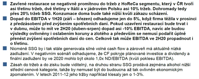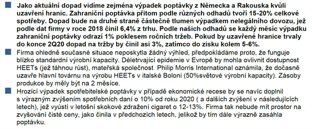Vládní opatření přímo dopadají na spotřebu, přesnější odhady je ale složité stanovovat. Firma také od ledna čelí 10%, respektive 13% zvýšení spotřebních daní v Polsku a ČR. To krátkodobě zvedlo prodeje v prosinci, a 1HFY2020 (končící v březnu) by tak mělo navzdory pandemii COVID-19 dopadnout slušně. Přenesení daní do cen na klíčovém polském trhu probíhá, zatímco na českém trhu pravděpodobně zvýšení daní nebude plně přeneseno do koncových cen ani do konce května. Negativní dopad ve 2HFY2020 bude mít i oslabování zlotého a koruny. Plánované daňové úlevy ze strany státu alespoň částečně sníží dopad do zisku.