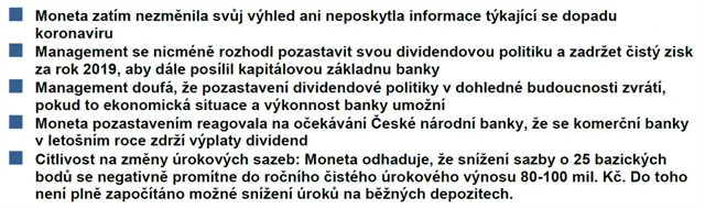 V současné situaci považujeme za rozumné udělat krok zpět a čekat na lepší posouzení ekonomického dopadu koronaviru. MONETA již dříve prokázala své zaměření na vracení kapitálu akcionářům (výplaty dividend, plánovaný odkup akcií), takže se nebojíme, že by začala budovat nadbytečný kapitál, který by negeneroval zisk poté, co přejde současná krize. V prognózách počítáme s rostoucími rizikovými náklady, které by však do budoucna musely být stejně zvyšovány.