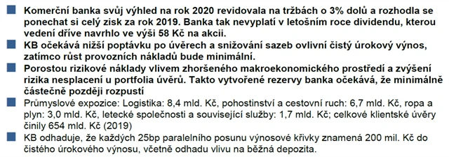 Očekávali jsme, že KB upraví svůj výhled a pozastaví dividendu za rok 2019, i když toto opatření nepovažujeme za nutné, protože kapitálová pozice banky je velice silná a základní kapitál Tier 1 je (bez výplaty dividendy) na úrovni 19,7 % (ke konci roku 2019). Rizikové náklady byly v posledních obdobích velice nízké, až se jejich rozpouštění promítalo pozitivně do hospodaření banky. Není tedy divu, že jednou z hlavních změn ve výhledu KB je právě zvýšení rizikových nákladů.