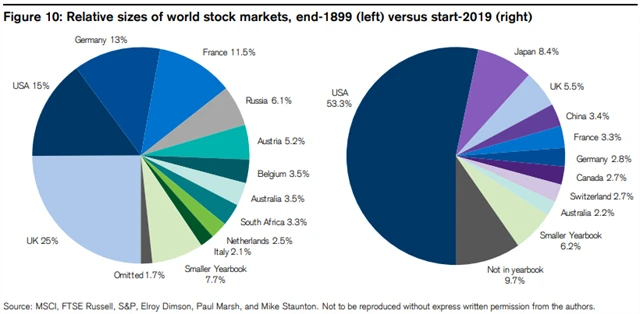 První graf je možná až notoricky známý z jiných médií, ale pro pochopení situace nic lepšího nemáme. Porovnání relativní velikosti akciových trhů ve světě před sto lety a v roce 2019 ukazuje na ústup Evropy a hegemonii USA.