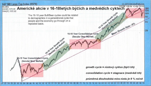 Níže uvedený graf amerického akciového indexu S&P 500 dobře ilustruje jeho slova. 16- až 18leté cykly, ve kterých se trh vyvíjel, se ve výsledku odrážejí v průměrném ročním zhodnocení okolo 8 procent.