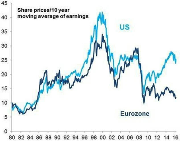 Evropa splňuje všechny výše zmíněné podmínky, píše na svém webu A Wealth of Common Sense Ben Carlson. Zavedení záporných úrokových sazeb, mizivý hospodářský růst a nepříznivý demografický vývoj, a navíc nezanedbatelný faktor v podobě toho, že se Evropská unie svým autorům tak trochu rozkližuje před očima. Všechny tyto vlivy přispívají k relativně atraktivnímu ocenění evropských akcií v porovnání s americkou konkurencí. Z grafu od společnosti AMP Capital je patrné, že CAPE (cyklicky očištěné P/E) obou trhů se - zejména v období po konci velké finanční krize - hodně liší.