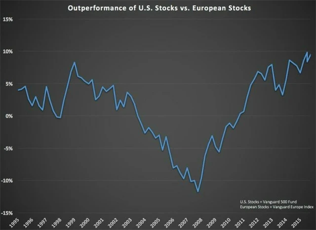 Rozdíl 9,51 procentního bodu u roční výkonnosti je ohromující, a přestože svou roli hrají také kurzy měn (silnější dolar a klesající euro), jde o výjimečný výsledek. Investoři do evropských akcií se mohou utěšovat alespoň tím, že mají zajímavější dividendový výnos. Rostoucí nadvýkonnost amerických akcií je zobrazena v grafu, který porovnává rozdíl v ročních výnosech v klouzavých pětiletých obdobích.