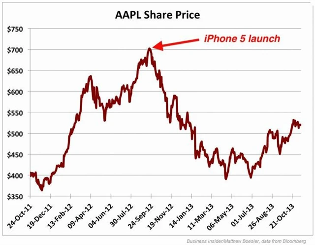 Klíčovým datem pro akcie Apple se stalo 21. září 2012, kdy šel do prodeje dlouho očekávaný iPhone 5. Na dno jeho akcie klesly letos v dubnu. V současnosti se jejich cena pohybuje kolem 520 USD za akcii.