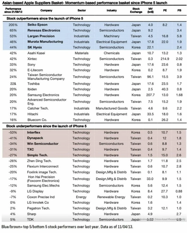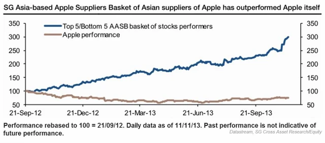 Apple je v posledním roce pro investory zklamáním. Akcie se dostaly na vrchol k 700 USD v roce 2012, nyní jsou stále o 25 % levnější. Stratég ze Société Générale Vivek Misra poukazuje na to, že se od té doby mnohem více daří asijským dodavatelům kultovní technologické firmy.