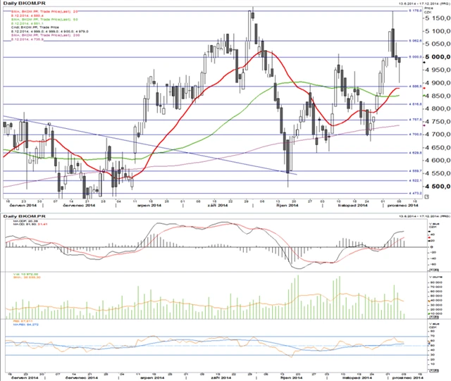 Technická analýza cen akcií ČEZ a Komerční banky. (9. 12. 2014)