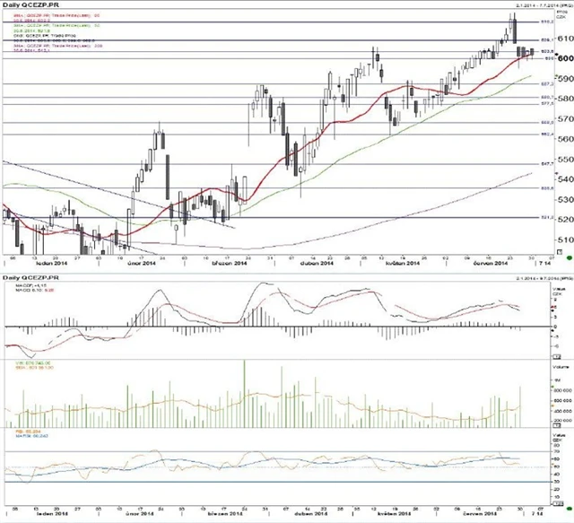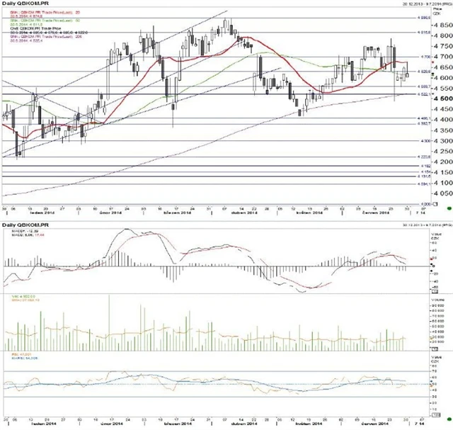 Technická analýza cen akcií ČEZ a Komerční banky. (1. 7. 2014)
