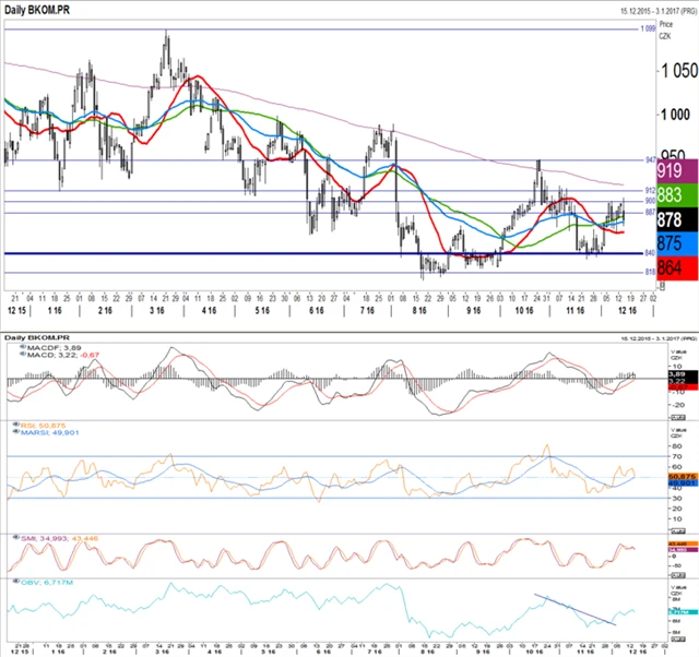 Akcie Komerční banky se minulý týden dostaly mírně nad 900, nedokázaly se ale nad touto hladinou udržet. MACD se shora přibližuje ke své signální linii. U RSI nastal obrat a je nyní jen kousek od propadu pod 50bodovou hranici. SMI překřížil svoji pomalejší linii. Technické indikátory signalizují pokles.