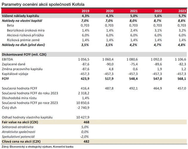 Pro určení ceny akcií Kofoly ČS použila banka model diskontovaného volného cash flow. Férovou hodnotu odhadla na 468 Kč za akcii, cílovou cenu pak stanovila na 482 Kč. "Cílová cena je 65 % nad aktuální tržní cenou, což představuje potenciální celkový výnos včetně dividendy okolo 70 %," zmínil Jiří Kostka.