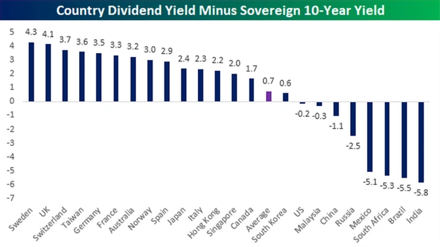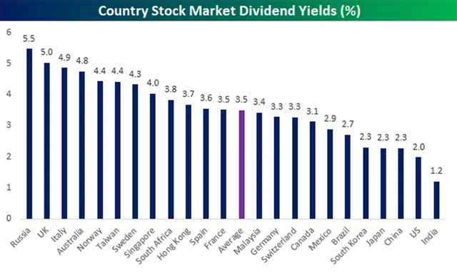Možná překvapivá je dividendová (ne)atraktivita americké burzy, která se krčí na předposledním místě. Situace je opačná oproti té v Rusku - ceny akcií jsou vysoké a ocenění také. Navzdory množství hotovosti, kterou některé velké americké společnosti disponují, nedosahuje dividendový výnos ani úrovně výnosu 10letých vládních dluhopisů.