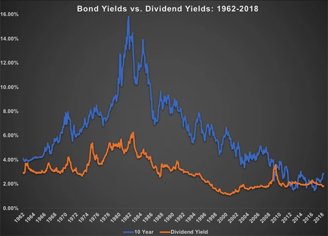 Dnes se sice může zdát, že jde o novou situaci, protože poprvé od roku 2013 je rozdíl mezi výnosy 10letých vládních dluhopisů USA a dividendovými výnosy přes procentní bod ve prospěch dluhopisů. Z dlouhodobého hlediska však nejde o nic výjimečného. Od začátku 60. let minulého století je běžné, že dluhopisy nesou ročně více než dividendy. I když situace na začátku 80. let byla skutečně extrémní, průměrný rozdíl mezi dividendovým výnosem a výnosem 10letého dluhopisu od roku 1962 je více než 300 bazických bodů. Před rokem 1950 na tom byly lépe dividendy, protože firmy se pomocí nich snažily zatraktivnit akcie.