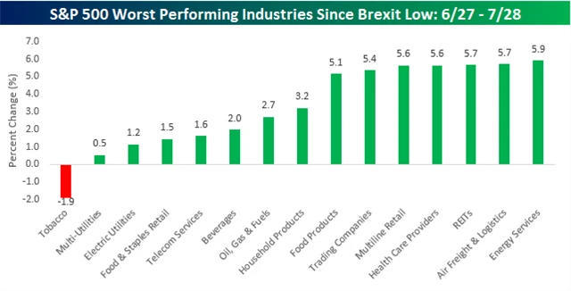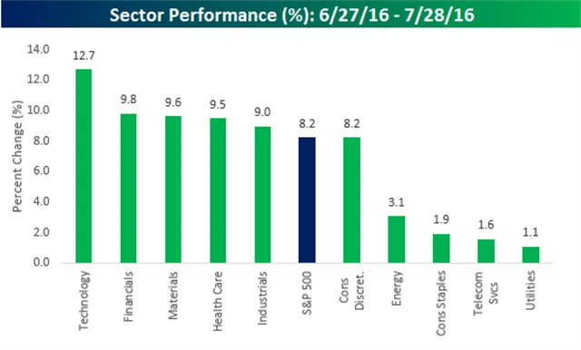 Grafy zobrazují výkonnost jednotlivých odvětví od závěrečné ceny 27. června 2016 do konce obchodní seance o měsíc později, ted yk 27. červenci 2016 včetně.