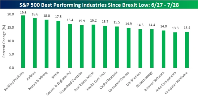 Bližší pohled odhaluje celkem 60 subsektorů v rámci indexu S&P 500. 59 z nich je od minim po britském referendu v plusu, pouze jeden je ve ztrátě. O výrobcích polovodičů již byla řeč (+17,5 %), tři podsektory ale zažívají ještě výraznější rally (stavební produkty +19,6 %, aerolinie +18,6 %, kovy a těžba +18,0 %). Nejvýkonnější subsektory jsou mixem technologií, cyklických společností a také brokerů (odvětví označené jako kapitálové trhy).