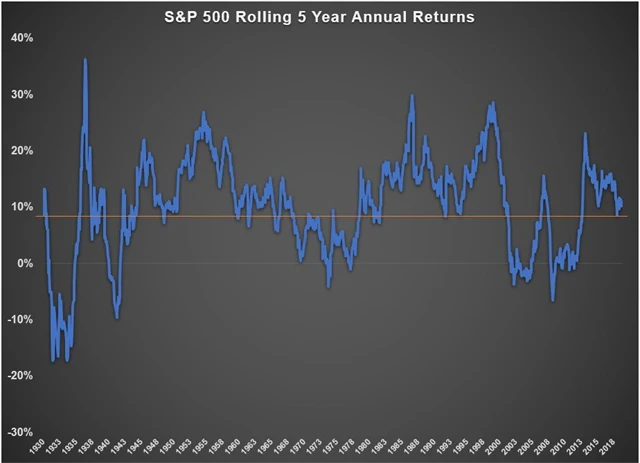 Od začátku 30. let 20. století dosahuje americký akciový index S&P 500 v pětiletém horizontu průměrného ročního výnosu minimálně 8 % v dvou třetinách případů. V rámci současného cyklu S&P 500 výnosů v této výši dosahuje od podzimu 2013. Výjimkou byl jen loňský prosinec.