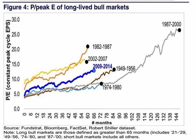 Tom Lee z Fundstrat Global Advisors demonstruje, jak se mění ukazatel P/E během dlouhých býčích trhů. Podle těchto pohybů a jeho odhadů má současný býk před sebou ještě dlouhý život.