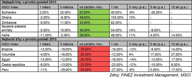 Zatímco většina akciových trhů až do května rostla, české akcie měřené indexem PX od začátku roku ztratily téměř 20 %, podle MSCI dokonce 23 %. Hůře jsou na tom jen akcie v Peru. Naopak nejvíce se dařilo akciím v Bulharsku. Které trhy by mohly být překvapením druhé poloviny roku?