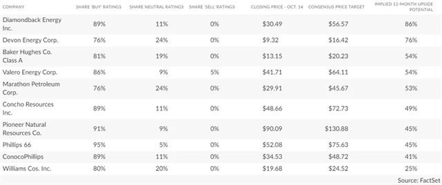 V polovině října bylo v indexu S&P 500 94 akcií, jež měly od analytiků na Wall Street (podle agentury FactSet) alespoň 75 % nákupních doporučení. Mezi favority Wall Street patří zhusta akcie energetických firem (hodně štěstí, ale trh pro rok 2021 očekává vyšší ceny ropy). Z 25 vybraných titulů s největším potenciálem růstu ceny (podle cílových cen analytiků) je jich hned 10 z odvětví energetiky.