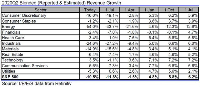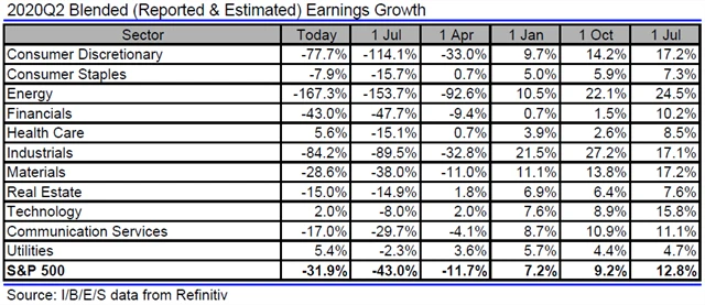 Jak se vyvíjejí odhady růstu či poklesu zisků a tržeb amerických firem za 2Q2020?