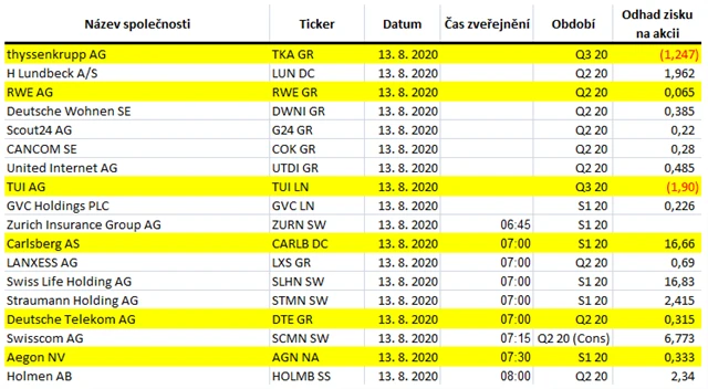 Které světové firmy představí výsledky hospodaření za uplynulý kvartál v týdnu od 10. srpna a jaké zisky v rámci indexů S&P 500 a STOXX Europe 600 očekávají analytici oslovení agenturami Refinitiv a Bloomberg?