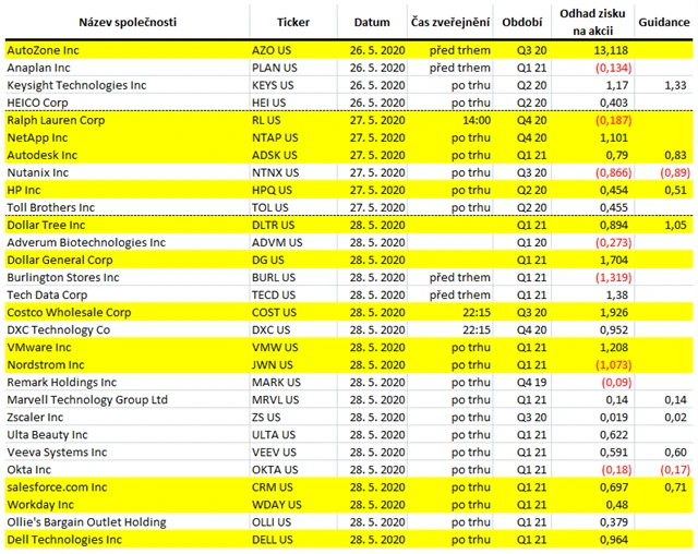 Které světové firmy představí výsledky hospodaření za uplynulý kvartál v týdnu od 25. května a jaké zisky v rámci indexů S&P 500 a STOXX Europe 600 očekávají analytici oslovení agenturami Refinitiv a Bloomberg?