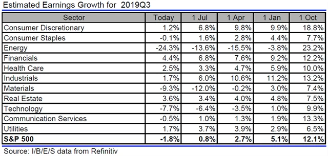 Jak se vyvíjejí odhady růstu či poklesu zisků amerických firem za 3Q2019?