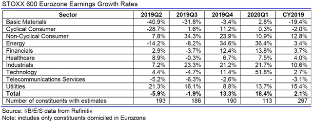 Jak se vyvíjejí odhady růstu či poklesu zisků evropských firem za 3Q2019?