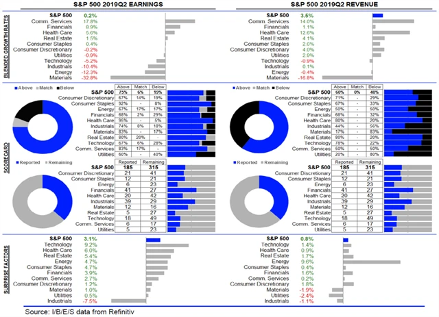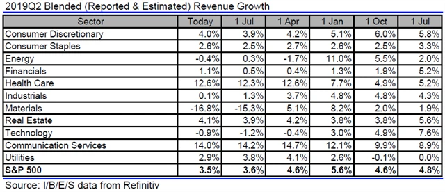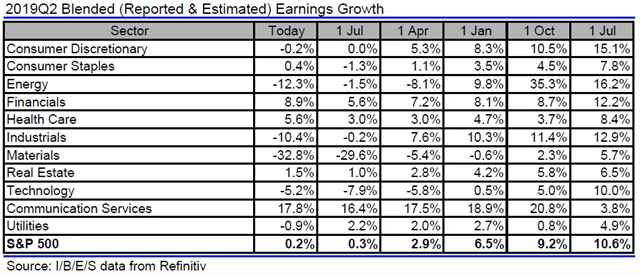 Jak se vyvíjejí odhady růstu či poklesu zisků a tržeb amerických firem za 2Q2019?