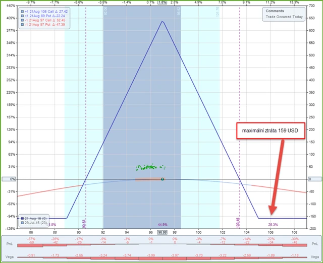 V důsledku poklesu implikované volatility kleslo i opční prémium a opční spread byl v zisku 196 USD, což je 123 % maximální potenciální ztráty.