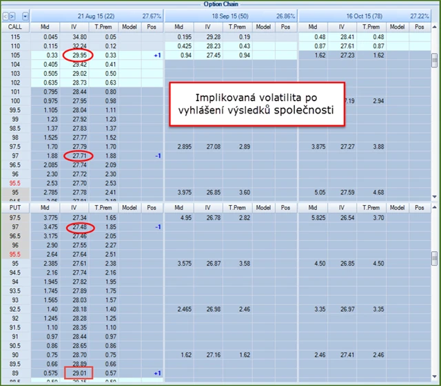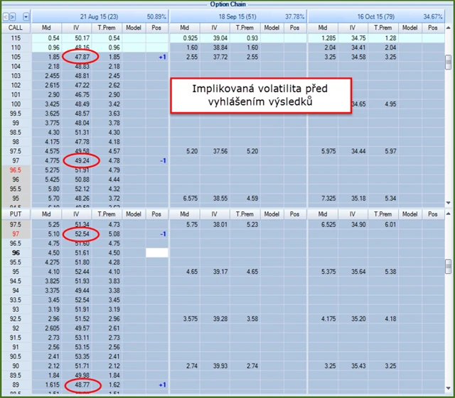 Ceny akcií se první obchodní den po vyhlášení výsledků mohou pohnout více, než je jejich průměrný denní pohyb. Při vysokých cenách opcí a s očekáváním poklesu implikované volatility je možné s použitím vhodné opční strategie vydělávat i přes výrazné změny cen akcií.