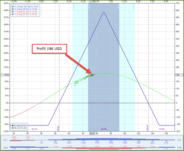 Akcie Facebooku den po oznámení výsledků poklesly až o 5,4 % na minimum 91,80 USD, ale i přes takto velký pohyb byl spread v zisku 123 USD. Bylo to proto, že zisk z poklesu implikované volatility byl vyšší než ztráta v důsledku změny ceny podkladového aktiva. V řeči řeckých písmen, pozitivní vliv vega byl vyšší než negativní vliv delta.