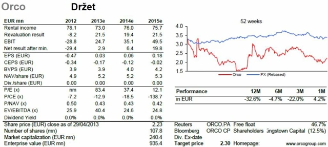 Zvýšili jsme cílovou cenu akcií společnosti Orco z 1,65 EUR na 2,30 EUR, a to především díky snižování zadlužení, refinancování GSG úvěru a nižší bezrizikové úrokové sazbě. Kvůli omezeným investicím a možnosti nové emise akcií vnímáme růstový potenciál jako omezený. Ponecháváme tedy doporučení na stupni "Držet".
