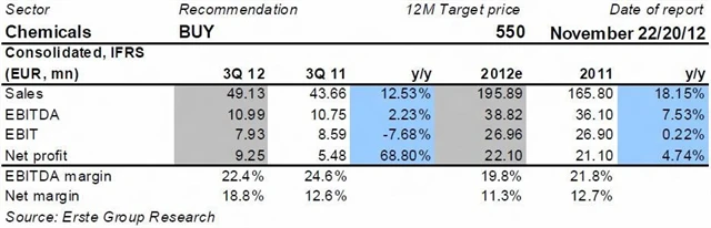 Úroveň EBIT by měla meziročně vykázat slabší vývoj oproti úrovni EBITDA kvůli nárůstu odpisů vzhledem k zařazení nové výrobní linky do užívání. Velmi volatilní položkou stále zůstávají čisté finanční náklady. Kvůli citelnému posílení české koruny oproti euru během 3Q2012 očekáváme kladný příspěvek nerealizovaných kurzových zisků v objemu zhruba 1,8 milionu eur. Celkové čisté finanční náklady však budou sníženy o odhadovaných 1,3 milionu eur vlivem zaúčtovaných nákladových úroků.
