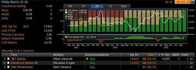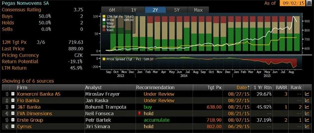 Jaký názor mají na akcie Pegas Nonwovens, Philip Morris ČR a O2 Czech Republic domácí a zahraniční analytici? Jaké jsou jejich dvanáctiměsíční cílové ceny a jak znějí jejich aktuální investiční doporučení? Nabízíme jejich přehled, jak jej k 2. 9. 2015 shromáždila agentura Bloomberg.