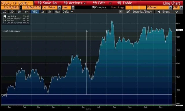 Jan Raška (Fio banka): "Po slabších výsledcích a sníženém výhledu EBITDA se podle mého názoru zvyšuje pravděpodobnost korekce cílových cen analytiků. Ty jsou obecně nyní nastaveny poměrně vysoko, i přes hranici 600 Kč. Naše cílová cena je prozatím na úrovni 598 Kč s doporučením 'držet'. V nejbližších týdnech a měsících u akcií Pegasu nevidím přílišný růstový potenciál, akcie se nachází na téměř šestiletých maximech a úrovně kolem 590 Kč bych nyní vnímal jako určitou rezistenci."