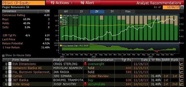 Josef Novotný (Česká spořitelna): "Od čtvrtého kvartálu by mělo být hospodaření Pegasu příznivě ovlivňováno egyptskou výrobní linkou, která je už v plném provozu. Zůstáváme pozitivní na tento titul s cílovou cenou 640 Kč na akcii a investičním doporučením 'akumulovat'."