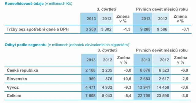 Tržby v ČR bez spotřební daně a DPH za třetí čtvrtletí roku 2013 se v porovnání se stejným obdobím roku 2012 zvýšily o 0,2 %, a to v důsledku příznivého vývoje cen ve výši 73 milionů Kč, což bylo částečně eliminováno nižším objemem prodejů a míry zastoupení jednotlivých značek v prodejích ve výši 70 milionů Kč z důvodu zvýšení cen společností Philip Morris ČR. Čisté tržby za prvních devět měsíců roku 2013 poklesly o 6,3 %.